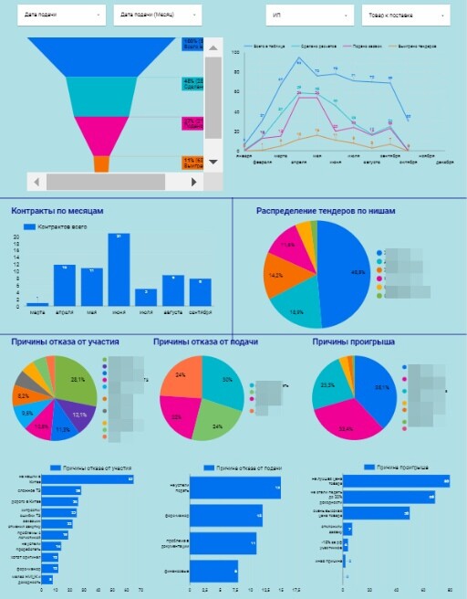 В 2021 году настроили систему администрирования, объединив необходимые данные из разных источников (Тендерплан, Трелло, ПланФакт). В 2022 года разработали дашборд с основными показателями для управления тендерным отделом.